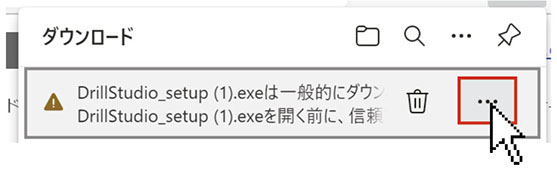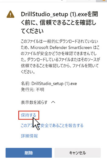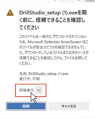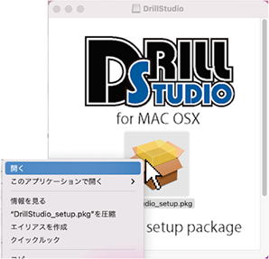 DrillStudioのインストーラをクリックする際に、右クリック、またはControlキーを押しながらクリックして、開くを選択してください。