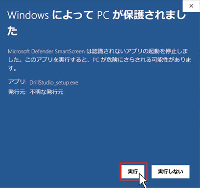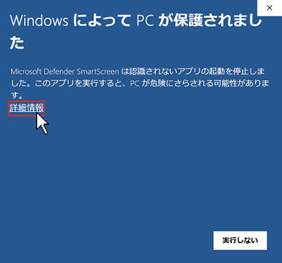 ④ Windows Defenderにブロックされ、左のようなメッセージが表示される場合があります。