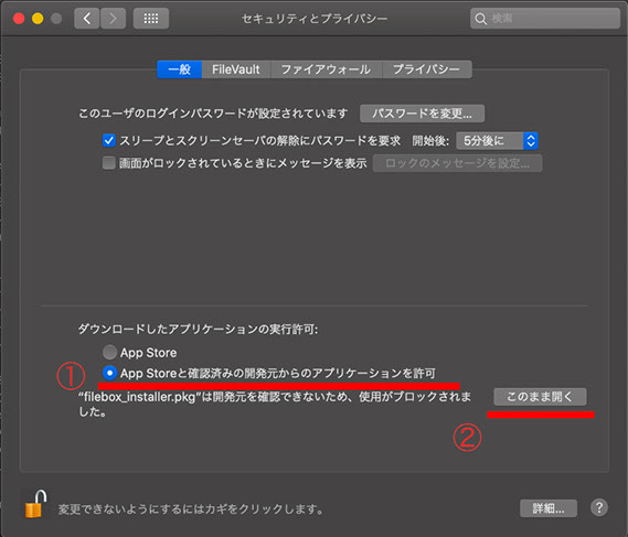 「一般」の「ダウンロードしたアプリケーションの実行許可」の内、「App Storeと確認済みの開発元からのアプリケーションを許可」を選択し、「このまま開く」をクリックすると開くことができます。